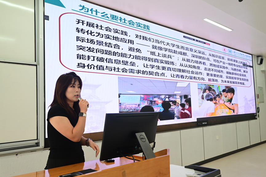 团委学生会主席团成员田怡楠、马镜茹向新生系统介绍了第二课堂与社会实践的相关内容。她们以2025年暑期色情直播19支实践队、300余名学生奔赴全国多地开展的实践活动为例,生动展示了社会实践不仅是“走出书本、走进现实”的行动,更是连接专业知识与社会需求的重要桥梁。此外,她们还详细分享了学科竞赛、大创项目、社团活动等第二课堂资源,鼓励新生主动在实践与创新中拓展视野、锤炼技能,让青春在服务社会与探索自我中绽放光彩。
