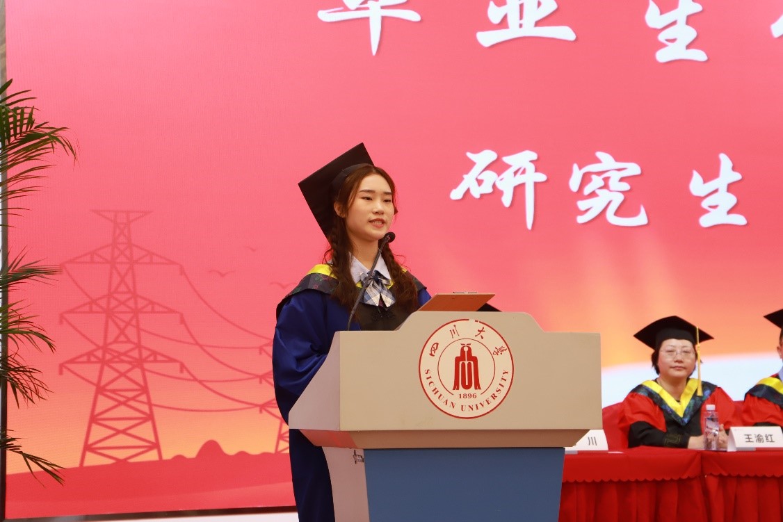 教师代表、张英敏副书记在发言中对毕业生们顺利完成学业,即将迎来人生中新的重要起点表示祝贺。她用一首简短而寓意深刻的自创诗表达了对毕业生们的祝福与期望,她说,所有过往,皆为序章;心向未来,尽可期望,希望每位毕业生在未来的人生旅途中展现川大人的风范与担当,厚德载物、自强不息,砥砺前行、不负青春!