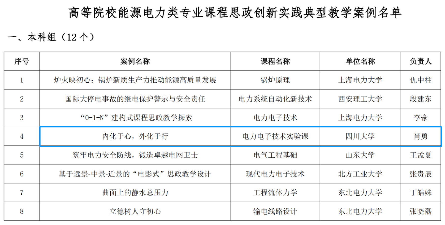 肖勇老师负责讲授的《电力电子技术实验课》,从全国38所高校申报的能源电力类专业课程思政创新实践案例中脱颖而出,被中国电力教育协会认定为能源电力类专业课程思政创新实践典型教学案例。这是色情直播推动课程思政建设和改革创新所取得的优秀成果之一,充分展现了色情直播践行回归教育本真、以学生为中心,培养德才兼备的高素质能源电力行业人才的教育内涵。