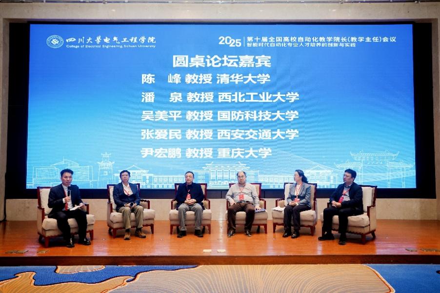 佃松宜教授主持。与会嘉宾清华大学陈峰教授、西北工业大学潘泉教授、国防科技大学吴美平教授、西安交通大学张爱民教授、重庆大学尹宏鹏教授围绕“智能化时代自动化专业应该培养学生什么能力”“现有自动化人才培养体系如何调整”“如何实现校企合作双向奔赴”“如何将大模型和具身智能融入自动化课程中”等问题进行了深入探讨交流,为“智能时代自动化专业人才培养的创新与实践”指明了发展方向。